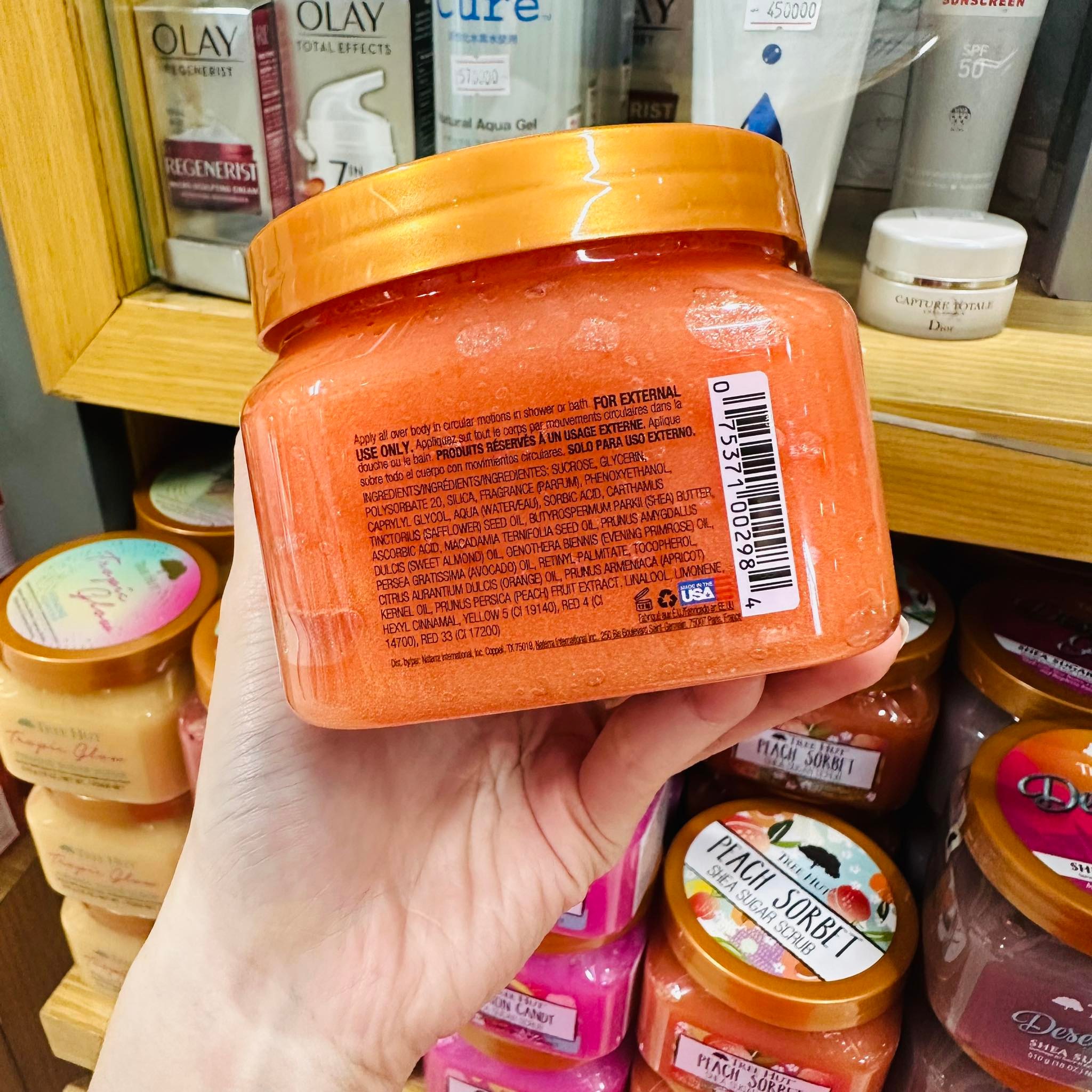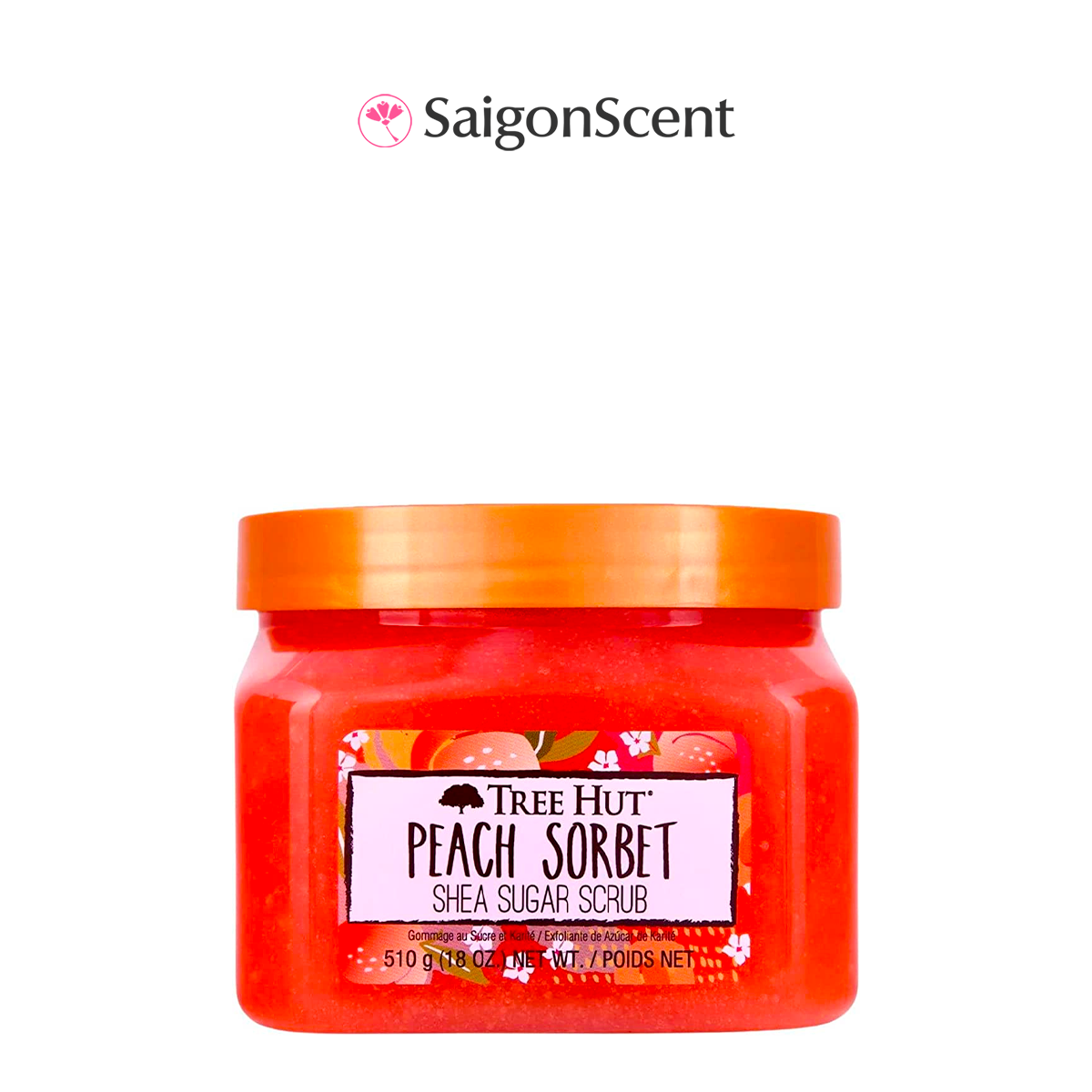 Tree Hut Shea Sugar Scrub PEACH SORBET Có mùi hương hoa ấm áp, lãng mạn với hương chủ đạo của quả Đào, Hoa Mai, Hoa Đào, mật táo và hoa Huệ